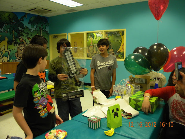 As I mentioned in Minecraft Party Part 1 there is not much Minecraft supplies out on the market. It's not like I could run to Party City and buy party supplies or order a cake from the bakery with a Minecraft theme. Luckily I found a seller who supports cancer research and sells edible cake toppers on ebay. It was so easy. I ordered a plain cake with only borders from the bakery and carefully added the cake topper. The topper was brightly colored and exactly like the Minecraft image. It really does not have a taste to it just like gum paste. I'm so glad I found it because my son asked me to make a cake that is in the Minecraft game and I did not have time to do it. Here's the seller on ebay if you're interested.